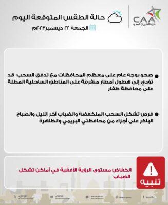 صحو بوجه عام على معظم المحافظات مع تدفق السحب قد تؤدي إلى هطول أمطار متفرقة على المناطق الساحلية المطلة على محافظة ظفار.