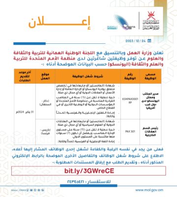 اعلنت وزارة العمل وبالتنسيق مع اللجنة الوطنية العمانية للتربية والثقافة والعلوم عن توفر وظيفتين شاغرتين لدى منظمة الأمم المتحدة للتربية والعلم والثقافة (اليونسكو) وذلك حسب البيانات الموضحةبالمنشور التالى:-