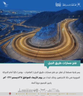 بلدية مسقط: غدًا .. فتح مسارات طريق الجبل “العامرات – بوشر”