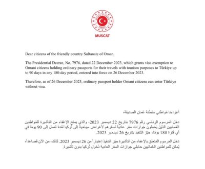 افادت سفارة الجمهورية التركية في مسقط مواطني سلطنة عُمان بشأن المرسوم الرئاسي رقم 7976 والذي يمنح الإعفاء من التأشيرة للمواطنين العمانيين الذين يحملون جوازات سفر عادية لسفرهم لأغراض سياحية إلى تركيا لمدة تصل إلى 90 يوما أي فترة 180 يومًا، حيث دخل المرسوم المتعلق بالإعفاء من التأشيرة حيّز التنفيذ إعتباراً من 26 ديسمبر 2023. لذلك، من الآن فصاعداً، يمكن للمواطنين العمانيين حاملي جوازات السفر العادية دخول تركيا بدون تأشيرة.