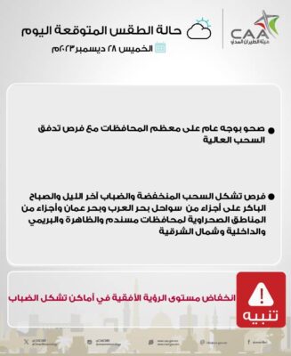 اعلنت هيئة الأرصاد الجوية عبر حسابها الرسمي على موقع التواصل الاجتماعي اكس عن حالة الطقس المتوقعة اليوم الخميس ٢٨ ديسمبر ٢٠٢٣م.
