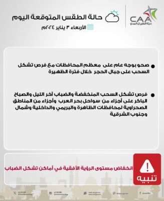 أعلنت هيئة الأرصاد الجوية عبر حسابها الرسمي على موقع التواصل الاجتماعي اكس عن حالة الطقس المتوقعة اليوم الأربعاء ٣ يناير ٢٠٢٤م.