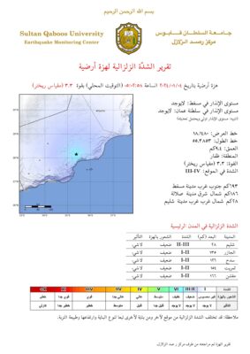 وهج الخليج - مسقط أفاد مركز رصد الزلازل بجامعة السلطان قابوس عبر حسابه الرسمي على موقع التواصل الاجتماعي " اكس " حول وجود هزة ارضية بمحافظة ظفار بلغت قوتها 3.3 ريختر دون تسجيل اي تأثيرات لها .