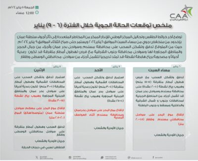 أفادت الأرصاد الجوية العمانية إلى تأثر أجواء سلطنة عمان بإخدود من منخفض جوي من مساء السبت ويستمر حتى صباح الثلاثاء حيث من المتوقع تدفق وتشكل السحب على محافظة مسندم وسواحل بحر عمان وأجزاء من جبال الحجر والمناطق المجاورة لها وسواحل محافظة جنوب الشرقية مع فرص لهطول أمطار متفرقة قد تكون رعدية أحياناً و مصحوبة برياح هابطة نشطة قد تمتد تدريجيا لتشمل أجزاء من سواحل محافظتي الوسطى وظفار