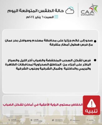 اعلنت هيئة الأرصاد الجوية عبر حسابها الرسمي على موقع التواصل الاجتماعي اكس عن حالة الطقس المتوقعة اليوم السبت ٦ يناير ٢٠٢٤م.