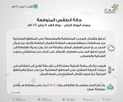 تدفق وتشكل السحب المنخفضة والمتوسطة على المناطق الساحلية من محافظات مسقط وجنوب الباطنة وشمال الباطنة وأجزاء من جبال الحجر مع فرص لهطول أمطار متفرقة قد تكون رعدية بالإضافة إلى فرص تدفق السحب وهطول الأمطار على أجزاء من محافظتي جنوب الشرقية والوسطى