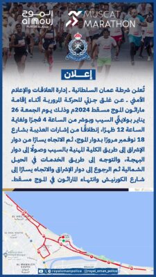 اعلنت شرطة عمان السلطانية ـ إدارة العلاقات والإعلام الأمني ـ عن غلق جزئي للحركة المرورية أثناء إقامة ماراثون الموج مسقط 2024م وذلك يوم الجمعة 26 يناير بولايتّي السيب وبوشر من الساعة 4 فجرًا ولغاية الساعة 12 ظهرًا، وفقا للمنشور المرفق.
