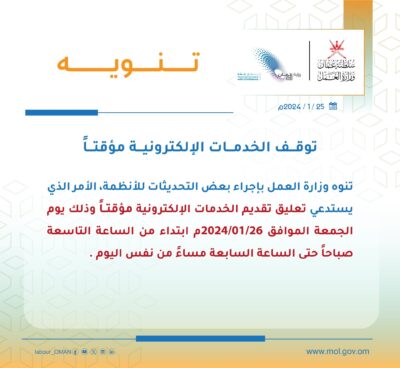 وهج الخليج - مسقط نوهت وزارة العمل عبر حسابها الرسمي على موقع التواصل الاجتماعي اكس بإجراء بعض التحديثات للأنظمة،الامر الذي يستدعي تعليق الخدمات الإلكترونية مؤقتاً.