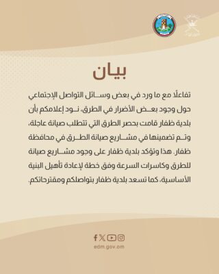اصدرت بلدية ظفار عبر حسابها الرسمي على موقع التواصل الاجتماعي اكس بيانًا نصه كما يلي :- ” تفاعلاً مع ما ورد في بعض وسائل التواصل الإجتماعي حول وجود بعض الأضرار في الطرق، نود إعلامكم بأن بلدية ظفار قامت بحصر الطرق التي تتطلب صيانة عاجلة، وتم تضمينها في مشاريع صيانة الطرق في محافظة ظفار”.