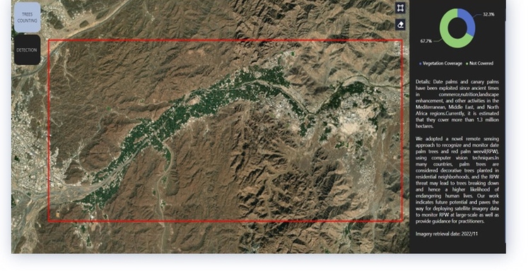 تم خلال المرحلة الأولى من التجربة تحليل صور الأقمار الصناعية باستخدام خوارزميات تم تدريبها لعد أشجار النخيل ومن ثم استخدام طائرة ذاتية القيادة (الدرون) للتأكد من كفاءة الآلية، وفي المرحلة الأخيرة تم إرسال فريق للقيام بالعد التقليدي للتحقق من دقة النتائج.