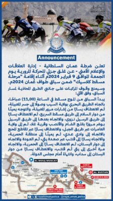 تعلن شرطة عمان السلطانية – إدارة العلاقات والإعلام الأمني – عن غلق جزئي للحركة المرورية يوم الجمعة الموافق 9 فبراير 2024م أثناء إقامة مرحلة مسقط كلاسيك ضمن سباق طواف عُمان 2024م.