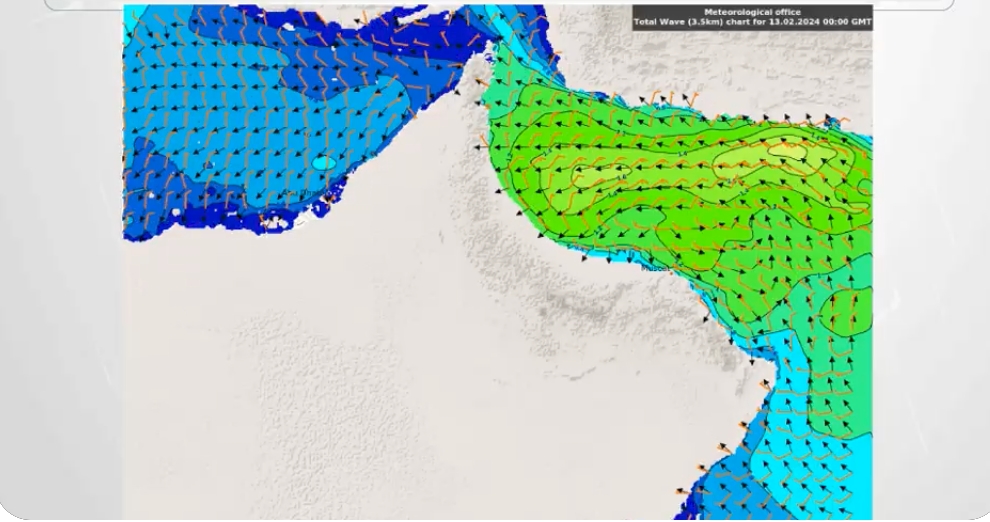 حذرت هيئة الأرصاد الجوية عبر حسابها الرسمي على موقع التواصل الاجتماعي اكس بالانتباه وأخذ الحيطة والحذر ارتفاع موج البحر متوسط إلى هائج الموج (1.5-3.5) متر على سواحل محافظة مسندم وسواحل بحر عمان أثناء تشكل السحب الرعدية المصحوبة بالرياح الهابطة النشطة تزامنًا مع تأثر أجواء سلطنة عمان بمنخفض الوبل بدءً من يوم غد 11 فبراير 2024.