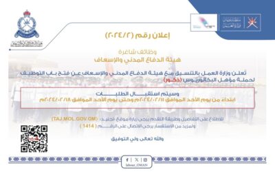 اعلنت وزارة العمل بالتنسيق مع هيئة الدفاع المدني والإسعاف عن فتح باب التوظيف لحملة مؤهل البكالوريوس (ذكور) ابتداءً من يوم الأحد الموافق 11 فبراير 2024م وحتى يوم الأحد الموافق 18 فبراير 2024م