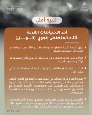 نشرت وزارة التربية والتعليم عبر حسابها الرسمي على موقع التواصل الاجتماعي اكس تنبيها أمنيا لأخذ الاحتياطات اللازمةأثناء المنخفض الجوي (الوبل)، وجاءت نقاط التنبيه كالآتي :-