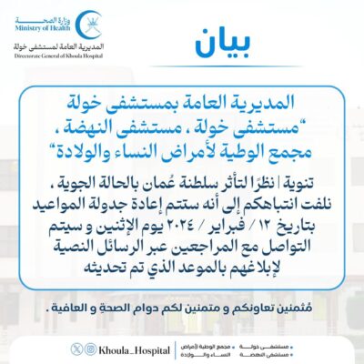 اصدرت مستشفى خولة تنبيهًا نظرًا لتأثر سلطنة عُمان بالحالة الجوية ، أنه سبتم إعادة جدولة المواعيد بتاريخ ١٢ فبراير ٢٠٢٤ يوم غدًا الإثنين و سيتم التواصل مع المراجعين عبر الرسائل النصية لإبلاغهم بالموعد الذي تم تحديثه .