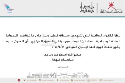 وهج الخليج - مسقط قررت بلدية مسقط إغلاق السوق المركزي مؤقتاً ، وذلك نظراً للأحوال الجوية التي تمر بها البلاد.