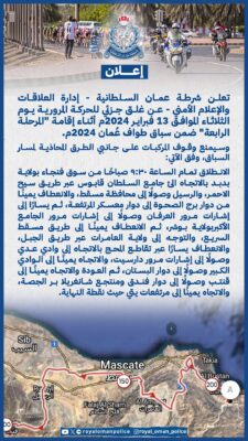 تعلن شرطة عمان السلطانية – إدارة العلاقات والإعلام الأمني – عن غلق جزئي للحركة المرورية يوم الثلاثاء الموافق 13 فبراير 2024م أثناء إقامة “المرحلة الرابعة” ضمن سباق طواف عُمان 2024م، وفقًا للمنشور المرفق: