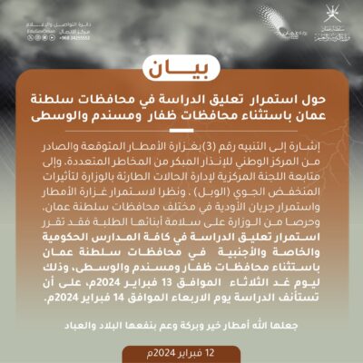 وقالت: “استمرار تعليق الدراسة ليوم غد الثلاثاء الموافق ١٣ فبراير ٢٠٢٤م في محافظات سلطنة عمان باستثناء محافظات ظفار ومسندم والوسطى”.