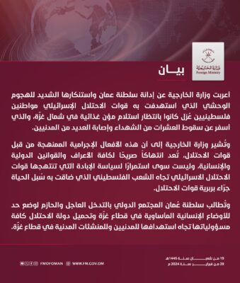أعربت وزارة الخارجية عن إدانة سلطنة عمان واستنكارها الشديد للهجوم الوحشي الذي استهدفت به قوات الاحتلال الإسرائيلي مواطنين فلسطينيين عُزل كانوا بانتظار استلام مؤن غذائية في شمال ‎غزّة، والذي أسفر عن سقوط العشرات من الشهداء وإصابة العديد من المدنيين.