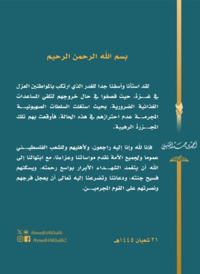 تعازينا لأهليهم، وللشعب الفلسطيني، ولجميع الأمة، مبتهلين أن يتغمد الله الشهداء الأبرار بواسع رحمته، إنا لله وإنا إليه راجعون.