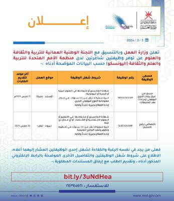 أعلنت وزارة العمل وبالتنسيق مع اللجنة الوطنية العمانية للتربية والثقافة والعلوم عن توفر وظيفتين شاغرتين لدى منظمة الأمم المتحدة للتربية والعلم والثقافة (اليونسكو) حسب البيانات الموضحة أدناه، فعلى من يجد في نفسه الرغبة والكفاءة لشغل إحدى الوظيفتين الاطلاع على شروط شغل الوظيفتين وتقديم الطلب مع إرفاق المستندات المطلوبة عبر الرابط الإلكتروني الآتي: