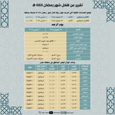 وهج الخليج - مسقط أصدرت دائرة الشؤون الفلكية بوزارة الأوقاف والشؤون الدينية تقريرا بشأن هلال شهر رمضان ١٤٤٥هـ