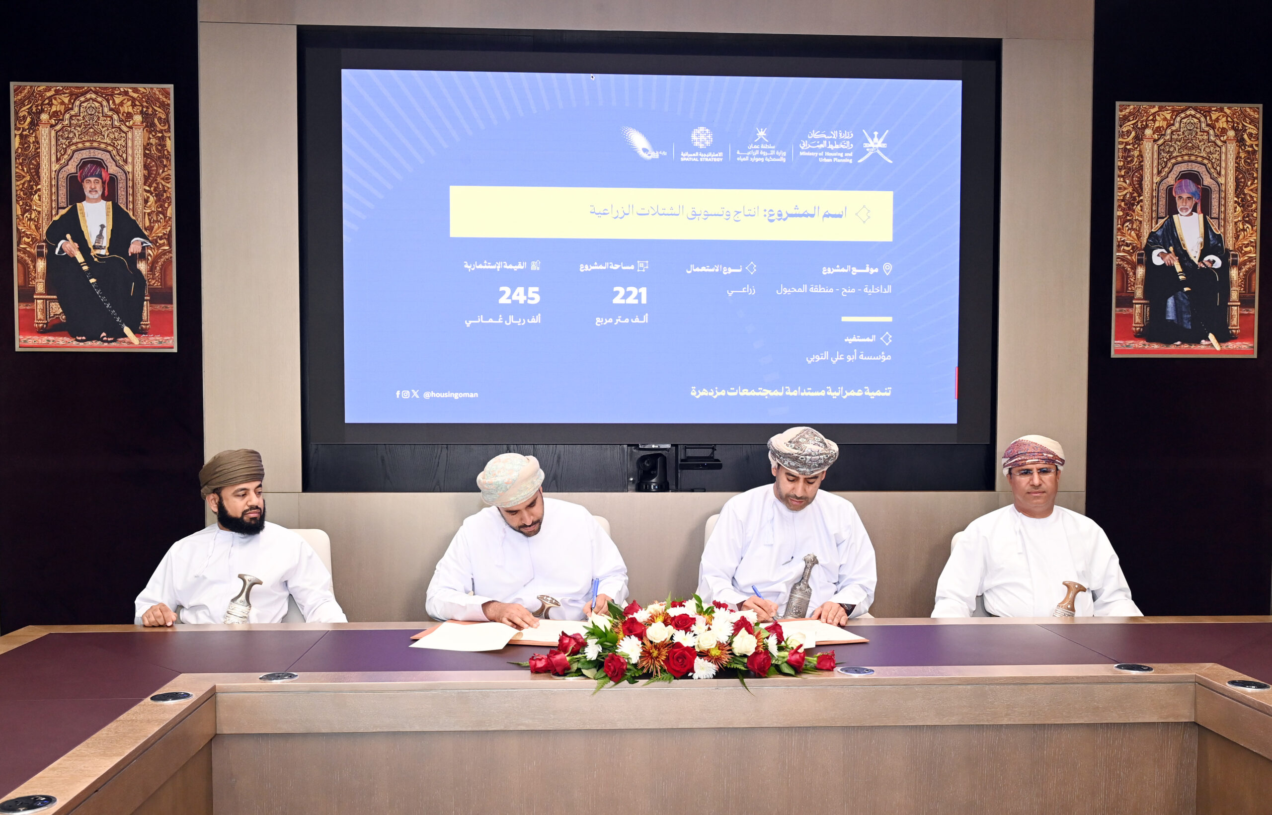 في إطار جهود وزارة الإسكان والتخطيط العمراني في المساهمة لتعزيز أولوية التنويع الاقتصادي والاستدامة المالية، وقعت الوزارة اليوم 12 عقد انتفاع بقيمة استثمارية تجاوزت 2.6مليون ريال عماني في القطاع الزراعي والصناعي، بالتعاون مع وزارة الثروة الزراعية والسمكية وموارد المياه، وهيئة تنمية المؤسسات الصغيرة والمتوسطة.