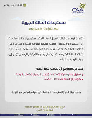 حيث تشير آخر توقعات وتحاليل المركز الوطني للإنذار المبكر من المخاطر المتعددة إلى استمرار فرص هطول أمطار متفرقة متفاوتة الغزارة على أجزاء من محافظات الظاهرة وجنوب الباطنة وقد تمتد لتشمل على أجزاء من محافظات الداخلية ومسقط وشمال وجنوب الشرقية والوسطى تؤدي إلى جريان الأودية والشعابحيث من المتوقع أن يصاحب هذه الحالة: