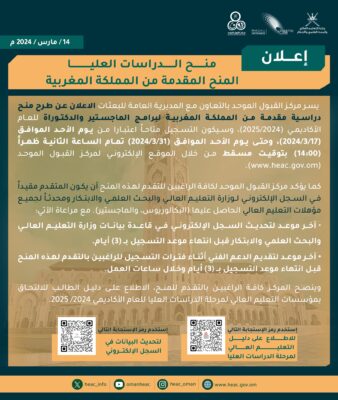 اعلن مركز القبول الموحد بالتعاون مع المديرية العامة للبعثات عن طرح منح دراسية مقدمة من المملكة المغربية لبرامج الماجستير والدكتوراة للعام الأكاديمي (2025/2024)، وسيكون التسجيل متاحاً اعتبارا من يوم الأحد الموافق (2024/3/17) ، وحتى يوم الأحد الموافق ( 2024/3/31) تمام الساعة الثانية ظهراً (14:00) بتوقيت مسقط من خلال الموقع الإلكتروني لمركز القبول الموحد .(www.heac.gov.om).