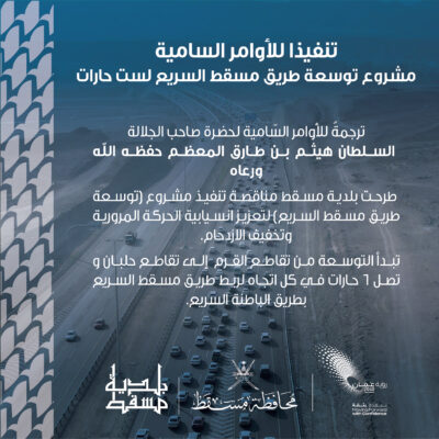 ترجمة للأوامر السامية لحضرة صاحب الجلالة السلطان هيثم بن طارق المعظم – حفظه الله ورعاه- طرحت بلدية مسقط مناقصة تنفيذ مشروع (توسعة طريق مسقط السريع) لتعزيز انسيابية الحركة المرورية وتخفيف الازدحام.
