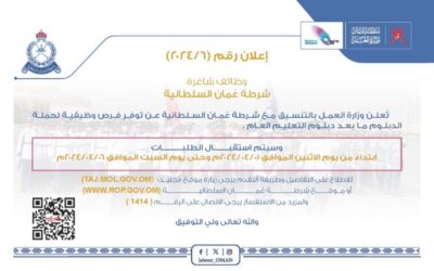 تُعلن وزارة العمل بالتنسيق مع شرطة عمان السلطانية عن توفر فرص وظيفية لحملة الدبلوم ما بعد دبلوم التعليم العام، وذلك ابتداءً من يوم الاثنين الموافق 1 أبريل 2024م وحتى يوم السبت الموافق 6 أبريل 2024م للاطلاع على الفرص المعروضة من خلال الرابط الآتي