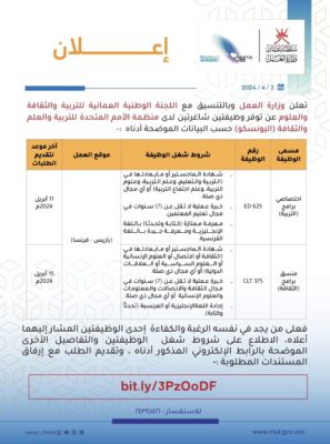 أعلنت وزارة العمل بالتنسيق مع اللجنة الوطنية العمانية للتربية والثقافة والعلوم عن توفر وظيفتين شاغرتين لدى منظمة الأمم المتحدة للتربية والعلم والثقافة (اليونسكو)