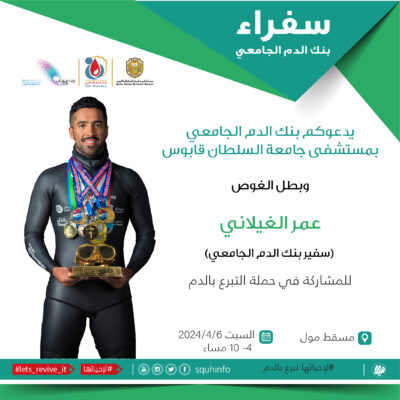 أعلنت جامعة السلطان قابوس عن حملة بالتبرع_بالدم⁩ اليوم السبت 6 إبريل 2024م في مسقط مول لتشاركونا في حملة بنك الدم الجامعي للتبرع بالدم .