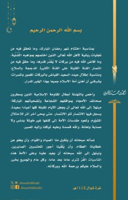 وأخص بالتهنئة أبطال المقاومة الإسلامية الذين يسطرون صحائف الأمجاد بمواقفهم الشجاعة؛ مبتهلا لله تعالى أن يجعل الأيام المقبلة كلها أعيادا سعيدة، وكل عام والجميع بخير.