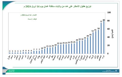 سجلت ولاية إبراء أعلى كمية أمطار بـ 80 ملم، تلتها ولاية المضيبي بـ 75 ملم، ثم ولاية القابل بـ 58 ملم، جرّاء الحالة الجوية التي تتأثر بها محافظات سلطنة عُمان حاليًّا.