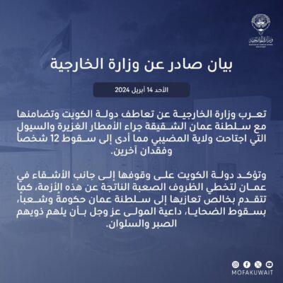 أعربت وزارة الخارجية الكويتية عن تعاطف دولة الكويت الشقيقة وتضامنها مع سلطنة عمان جراء الأمطار الغزيرة والسيول التي أدت الى وفاة عدد من المواطنيين بينهم أطفال وفقدان آخرين.