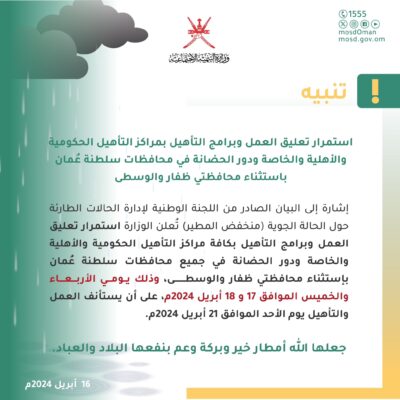 اصدرت وزارة التنمية الاجتماعية تنبيه، بناءً على مؤشرات الحالة الجوية؛ تقرر تعليق العمل وبرامج التأهيل في المراكز الحكومية والأهلية والخاصة ودور الحضانات يومي الأربعاء والخميس.