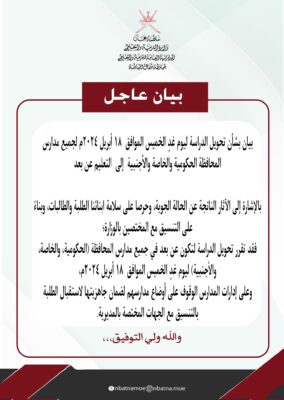 أصدرت تعليمية شمال الباطنة بياناً فيما يلي نصه : بالإشارة إلى الآثار الناتجة عن الحالة الجوية، وحرصا على سلامة ابنائنا الطلبة والطالبات، وبناءً على التنسيق مع المختصين بالوزارة؛ فقد تقرر تحويل الدراسة لتكون عن بعد في جميع مدارس المحافظة (الحكومية، والخاصة، والأجنبية) ليوم غد الخميس الموافق ١٨ أبريل ٢٠٢٤م، وعلى إدارات المدارس الوقوف على أوضاع مدارسهم لضمان جاهزيتها لاستقبال الطلبة بالتنسيق مع الجهات المختصة بالمديرية