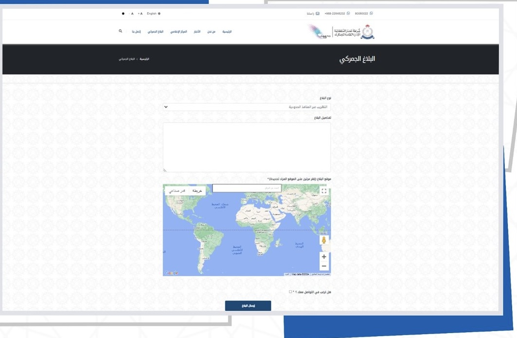 تعلن شرطة عمان السلطانية ممثلة في الادارة العامة للجمارك عن إطلاق خدمة البلاغ الجمركي ، وهي خدمة تتيح لكافة شرائح المجتمع التقدم بأي بلاغ يتعلق بعمليات التهريب الجمركي للمواد الممنوعة والمقيدة والتي تضر بصحة وسلامة الانسان والبيئة، ويمكن تقديم البلاغ عبر الموقع الإلكتروني للإدارة العامة للجمارك من خلال الرابط التالي: