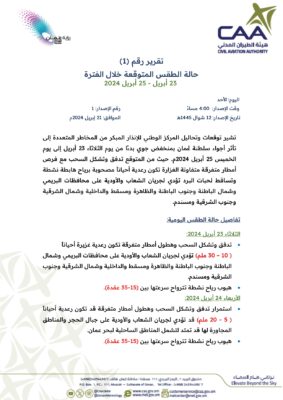 أشارت توقعات وتحاليل المركز الوطني للإنذار المبكر من المخاطر المتعددة إلى تأثر أجواء سلطنة عُمان بمنخفض جوي بدءًا من بعد غدٍ الثلاثاء إلى يوم الخميس المُقبل، ومن المتوقع تدفق وتشكّل السحب مع فرص هطول أمطار متفرقة متفاوتة الغزارة تكون رعدية أحيانًا مصحوبة برياح هابطة نشطة وتساقط لحبات البرد تؤدي لجريان الشعاب والأودية على محافظات البريمي وشمال الباطنة وجنوب الباطنة و الظاهرة و مسقط و الداخلية وشمال الشرقية وجنوب الشرقية و مسندم.