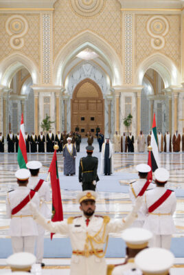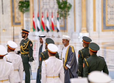 عقب ذلك صافح جلالةُ السُّلطان كبار مستقبليه من الجانب الإماراتي مبادلًا إيّاهم السّلام والتحيّة، فيما صافح صاحبُ السّمو الشيخ محمد بن زايد رئيسُ دولة الإمارات العربية المتحدة الوفد الرسمي المرافق لجلالتِه مرحّبًا بهم ومتمنّيًا لهم إقامة طيبّة.
