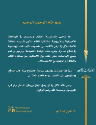 قال سماحة الشيخ احمد بن حمد الخليلي مفتي عام سلطنة عمان عبر حسابه الرسمي على موقع التواصل الاجتماعي اكس “نحيي انتفاضة الطلاب والمدرسين في الجامعات الأمريكية والأوروبية استنكارا للإبادة الجماعية التي تمارسها سلطات الاحتلال في قطاع غزة، ونرجو أن تعم جميع الجامعات.