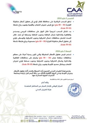 ومن المتوقع أن يصاحب هذه الحالة الجوية أمطار متفاوتة الغزارة (20) – 60 ملم) تؤدي إلى جريان الشعاب والأودية، وتكون ذروة الحالة يوم الخميس.