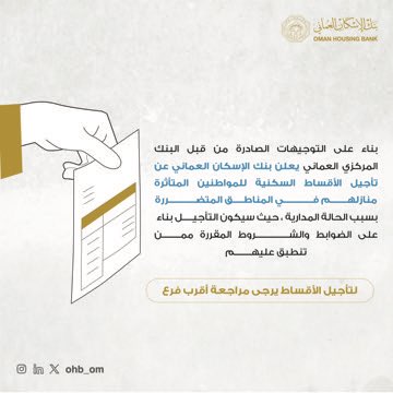 اعلن بنك الاسكان العماني عبر حسابه الرسمي على موقع التواصل الاجتماعي اكس عن تأجيل الأقساط السكنية للمواطنين المتأثرة منازلهم في المناطق المتأثرة بسبب الحالة المدارية منخفض المطير وفق الضوابط والشروط المقررة ممن تنطبق عليهم.