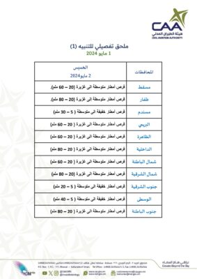 أصدرت الأرصاد الجوية التنبيه الأول بشأن الحالة الجوية المتوقعة ونظراً لغزارة الأمطار الرعدية و المصحوبة برياح هابطة نشطة وتساقط لحبات البرد المتوقع هطولها نهار الخميس حتى ليل يوم الخميس على محافظات البريمي وشمال الباطنة وجنوب الباطنة ومسقط والداخلية والظاهرة وشمال الشرقية وظفار مع كميات أمطار تتراوح من 20-80 ملم تؤدي لجريان الشعاب والأودية، وهطول أمطار متفرقة متفاوتة الغزارة على محافظات مسندم والوسطى وجنوب الشرقية.
