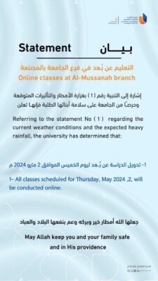 اعلنت جامعة التقنية والعلوم التطبيقية فرع المصنعة، عبر حسابها الرسمي على موقع التواصل الاجتماعي اكس عن تحويل الدراسة عن بعد غدًا ، وذلك تجنبا لتأثيرات المنخفض الجوي.