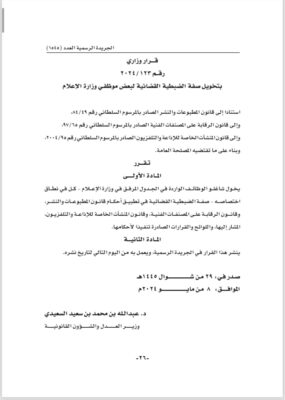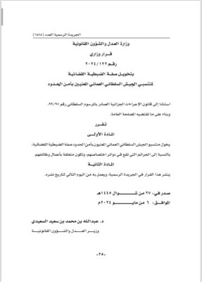 أصدرت وزارة العدل والشؤون القانونية قرارين وزاريين قضى الأول بتخويل صفة الضبطية القضائية لمنتسبي الجيش السلطاني العماني المعنيين بأمن الحدود فيما قضى القرار الثاني بتخويل صفة الضبطية القضائية لبعض موظفي وزارة الإعلام