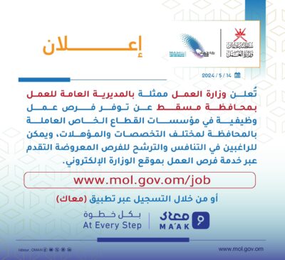 تُعلن وزارة العمل ممثلة بالمديرية العامة للعمل في محافظة مسقط عن توفر فرص عمل وظيفية في مؤسسات القطاع الخاص العاملة بالمحافظة لمختلف التخصصات والمؤهلات، للاطلاع والتسجيل في فرص العمل المعروضة يُرجى التقدم عبر خدمة فرص العمل أو عبر تطبيق معاك.