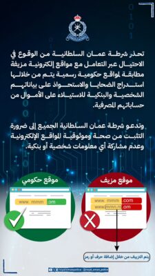 دعت شرطة عمان السلطانية الجميع إلى ضرورة التثبت من صحة وموثوقية المواقع الإلكترونية وعدم مشاركة أي معلومات شخصية أو بنكية.