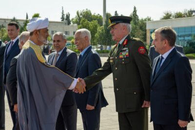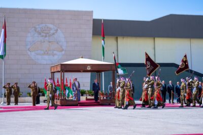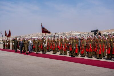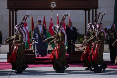 وبعد استقبال العاهل الأردني لأخيه جلالةِ السُّلطان المعظّم توجّه القائدان مرورًا بين صفّين من حرس الشرف من الحرس الملكي الأردني إلى ساحة المطار، حيث صافح جلالةُ السُّلطان كبار مستقبليه من الجانب الأردني، فيما صافح جلالةُ الملك الوفد الرسميّ المرافق للمقام السّامي.